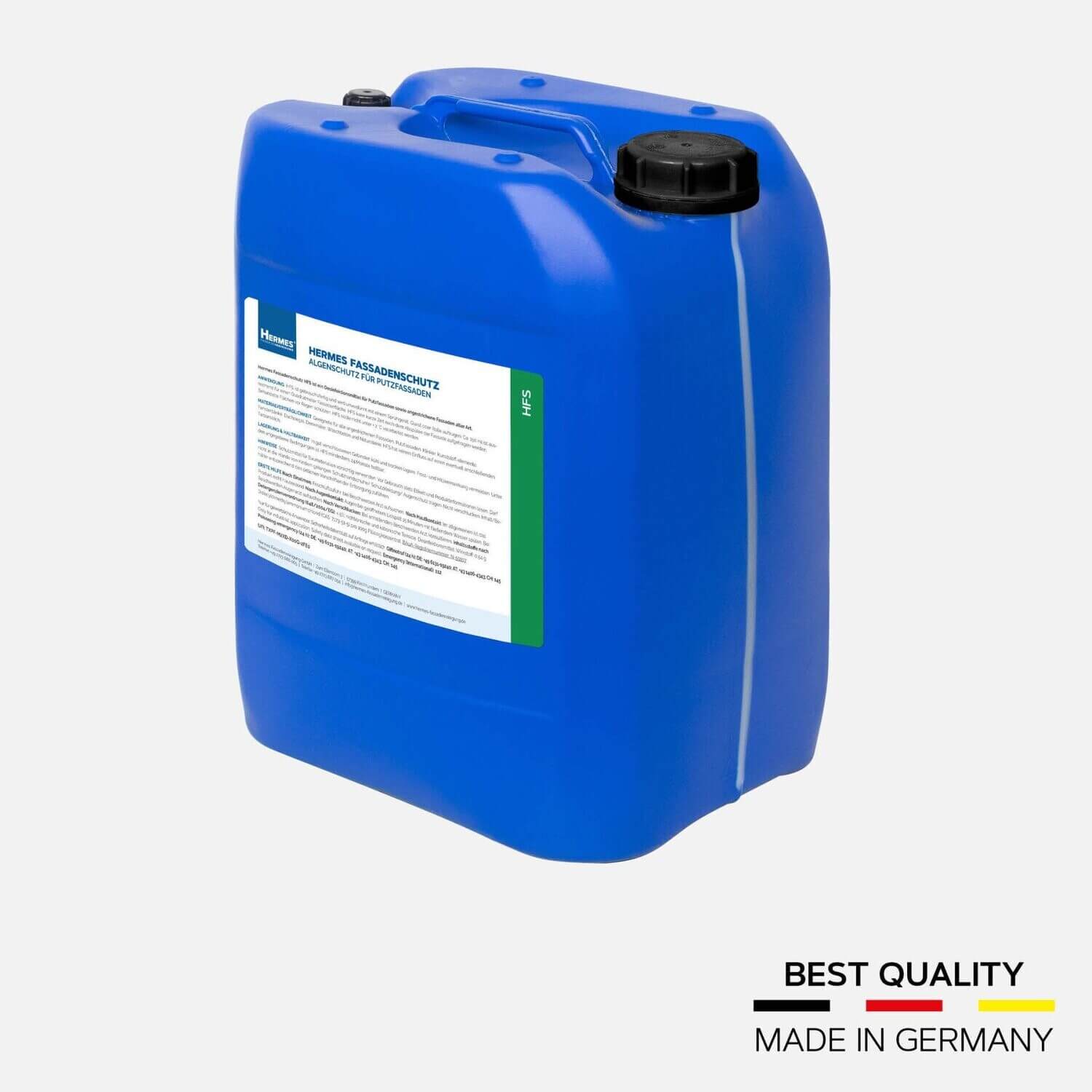 Če je čisto, ostane čisto. Po čiščenju fasade z našim HERMES čistilo fasade HF1 plus je videti kot nova. Da bi zagotovili, da ta učinek traja čim dlje, se nato uporabi naš HERMES fasadna zaščita HFS. Ta protimikrobna raztopina prodre globoko v pore fasade in s svojim dezinfekcijskim učinkom zagotavlja zanesljivo zaščito pred neposrednimi novimi okužbami. Vaše stranke bodo še dlje uživale v bleščeče čistih fasadah. HERMES fasadna zaščita HFS je dezinfekcijsko in zaščitno sredstvo za ometane fasade in vse vrste barvanih fasad. Dolgotrajna zaščita se oprime fasade in prodre globoko v pore. Učinkovito zavira ponovno nastajanje alg in plesni ter tako zagotavlja dolgotrajno zaščito. HFS je treba nanesti neposredno po čiščenju s HF1 plus. Dolgotrajna zaščita ne vpliva na naknadni nanos.